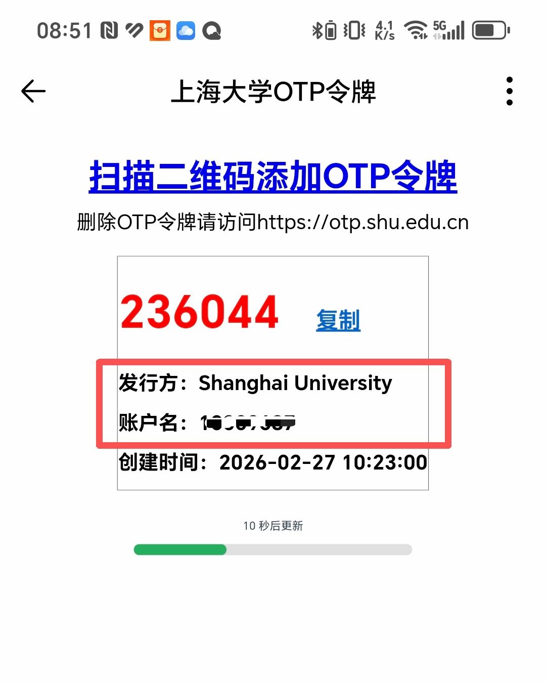 7、打开企业微信 -> 工作台-> 信息服务 ->OTP令牌,找到发行方为“Shanghai University”,账户名与登录学(工)号一致的令牌,将6位红色数字输入到“动态口令认证”窗口。更多sslvpn登录日志及错误信息可以登录otp.shu.edu.cn查看。